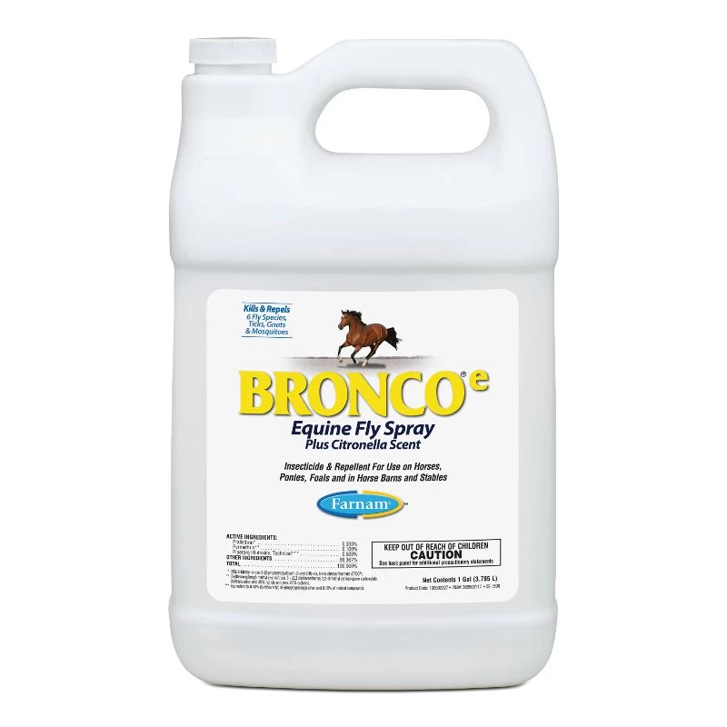 Bronco®e Equine Fly Spray is a staple for every stable. Kills six fly species, gnats, ticks, deer ticks, fleas, chiggers and lice! Insecticide and repellent for use on horses, ponies, foals and in horse barns and stables.