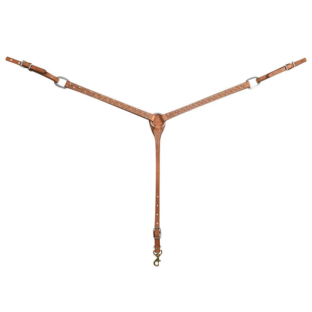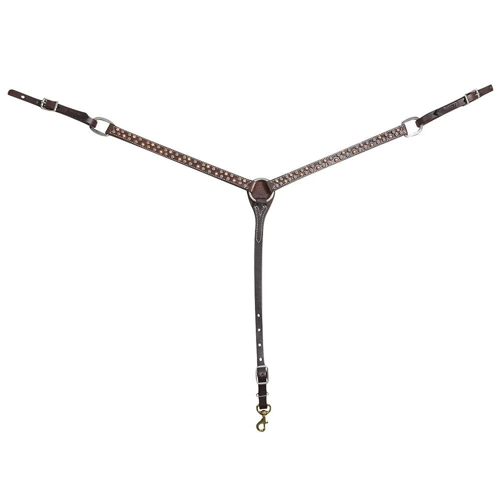 This Martin breast collar is constructed of natural or chocolate skirting leather and features copper parachute dots and antiqued dots. Stainless steel hardware.