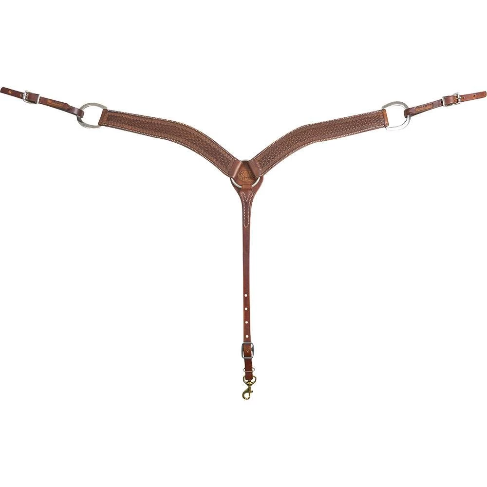 This Martin breast collar is constructed of natural skirting leather with weather antiquing and Mini Basket stamp for a timeless look. Stainless steel hardware.