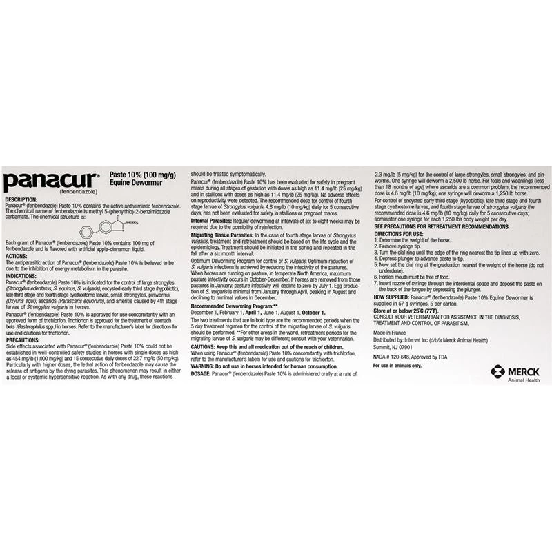 - PANACUR® POWERPAC (5 x 57 gram syringes) offers a complete course of treatment for a 1250 lb horse.