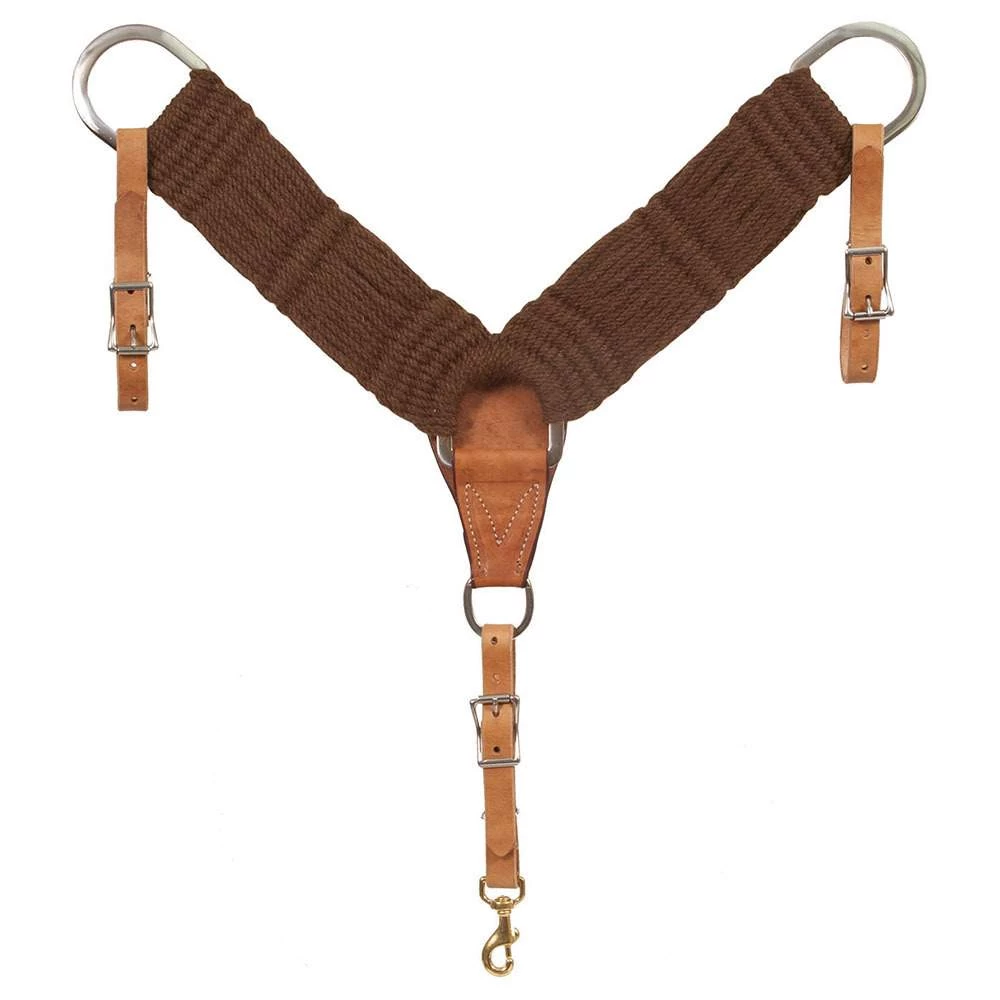 This Mustang Manufacturing breast collar is made from 29-strand hand-strung 100% alpaca cord. Features premium leather tugs and pinch guard center and 3″ flat stainless steel hardware. Standard horse size.