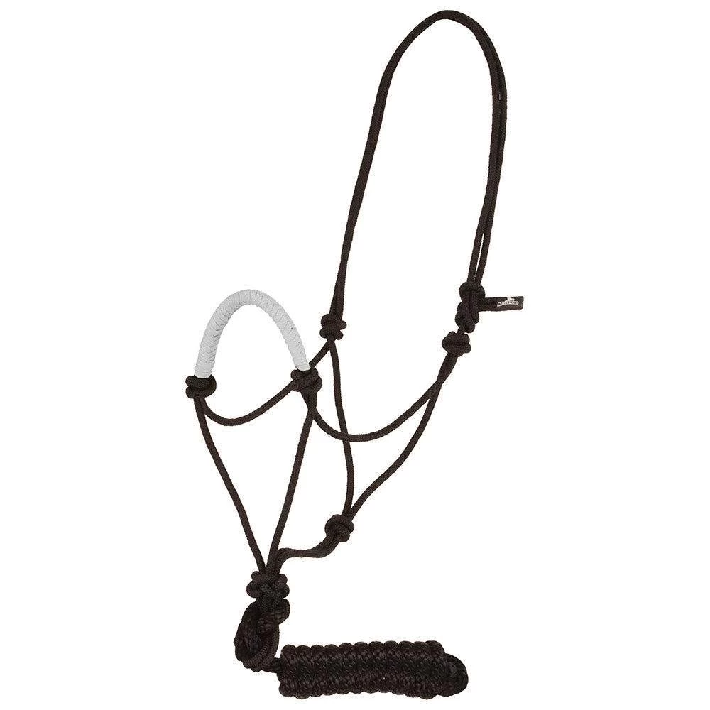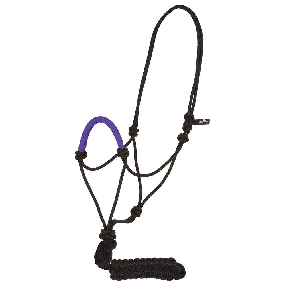 This Solid Rope Nose Halter is a great training aid. Correct your horse using subtle pressure. Solid nose band evenly distributes pressure. Rope halter is made from a continuous piece of rot resistant 5/16″ diamond poly rope with a braided color nose accent. 5/8″x8′ detachable lead. Long lasting. Washable with no hardware.