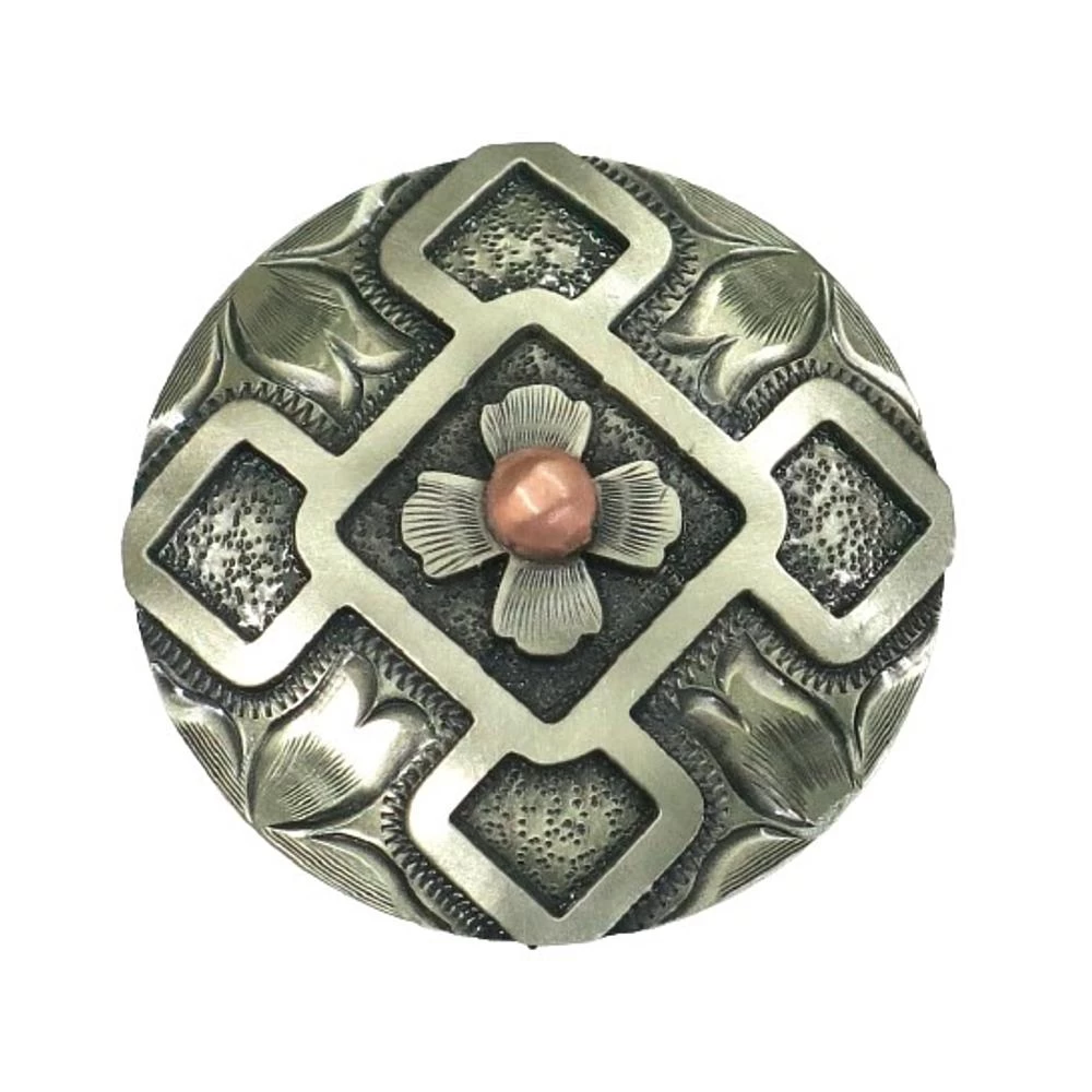 - The antique silver finish of the concho features four leaves with a sophisticated flower in the center, with a hint of copper, adding a touch of elegance and uniqueness to your tack.