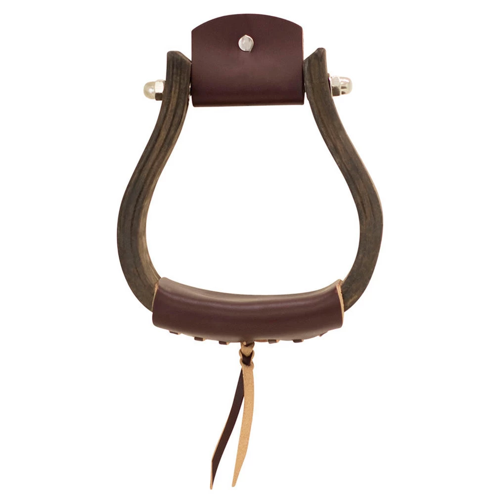 These cowboy tack Open Range 3-1/4″ Dark Wood Bell Stirrups are constructed of high quality dark wood and wrapped with dark leather. 4″ leather tassel at bottom center. Inner height measures roughly 5-1/4″ and outer height is 8-1/2″. Inner width measures 5-3/4″. 3″ Roller width. Sold in pairs.