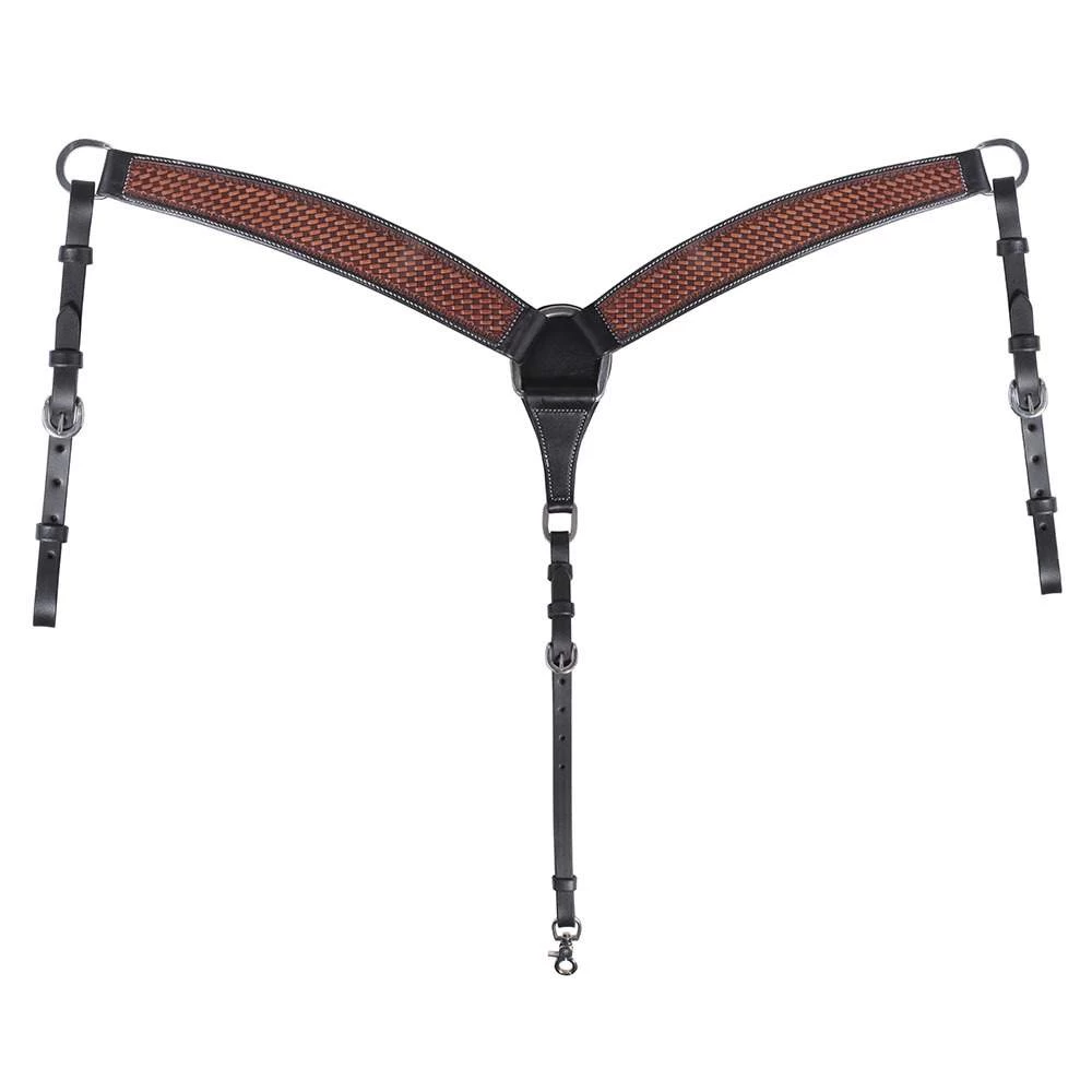 This versatile basketweave breast collar will be at home in almost every discipline. Hand-tooled chestnut brown leather with a black border. Quality construction.