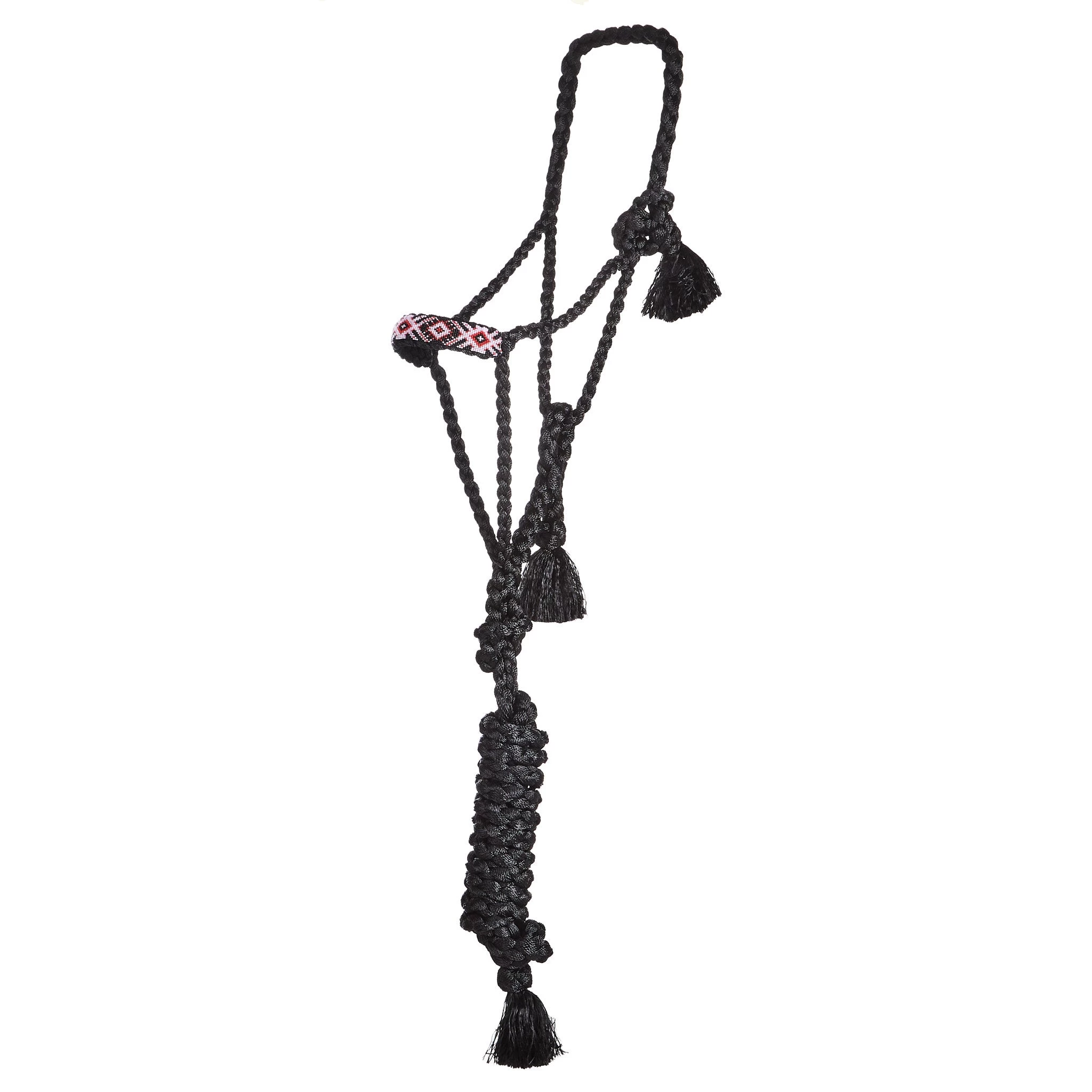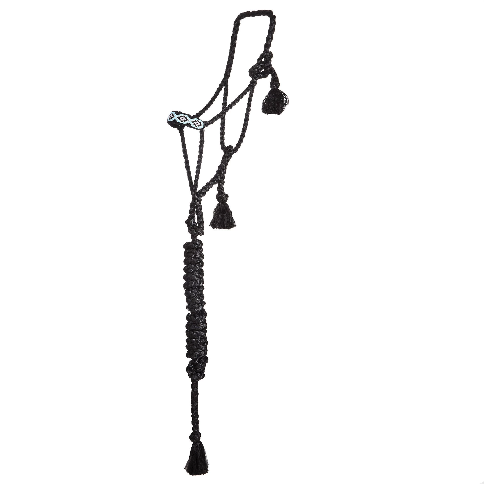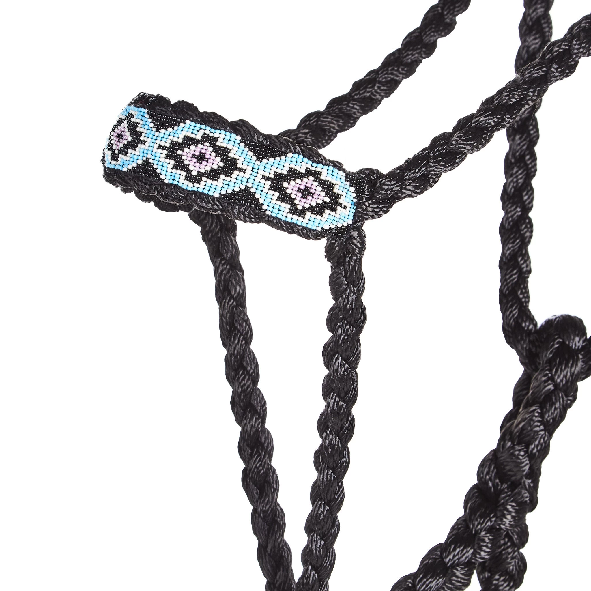 A braided soft yet sturdy white rope halter that features a flat nose and comes complete with a matching ten foot lead. Beaded nose band gives a fun fashion flare to the noseband.