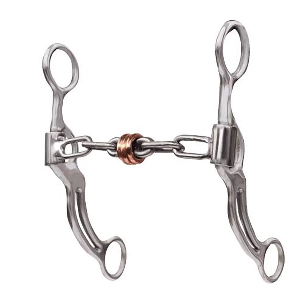 Provides the same great feel as the 8” shank with a softer, lighter leverage effect. The mouthpiece is a four-break chain with a center link interrupting the continual pressure across the mouth. This allows for more intensity on the outside pressure points. The copper center loose rollers aid in keeping the mouth moist.