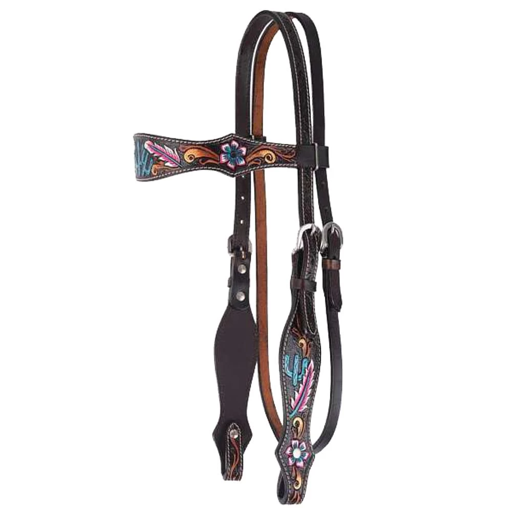 - The Reinsman Desert Feather Browband Headstall features vibrant hand-painted feather and cactus tooling with copper highlights.