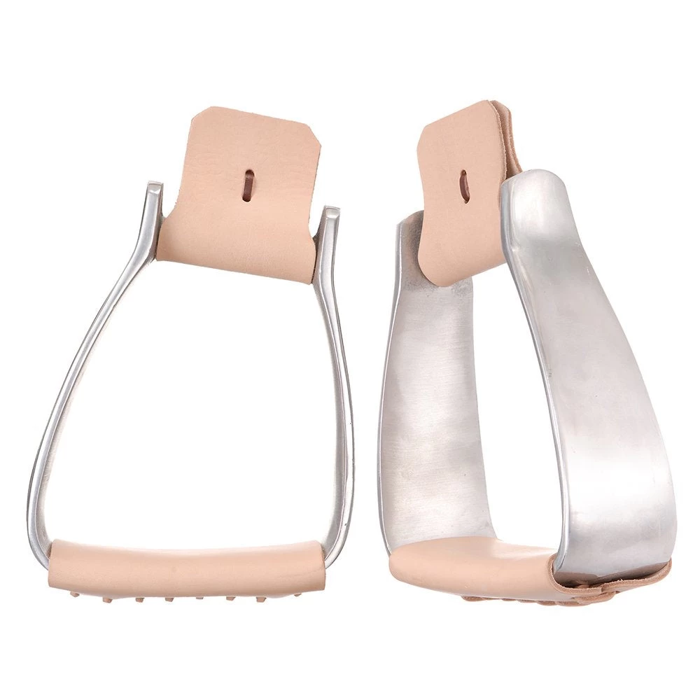 Lightweight aluminum roper stirrups with new angled design. The angled design of these stirrups allows your foot to be flat across the tread which gives you a more comfortable ride without the stress on your knees. Leather wrapped foot tread with rubber grip. 3″ neck and tread.