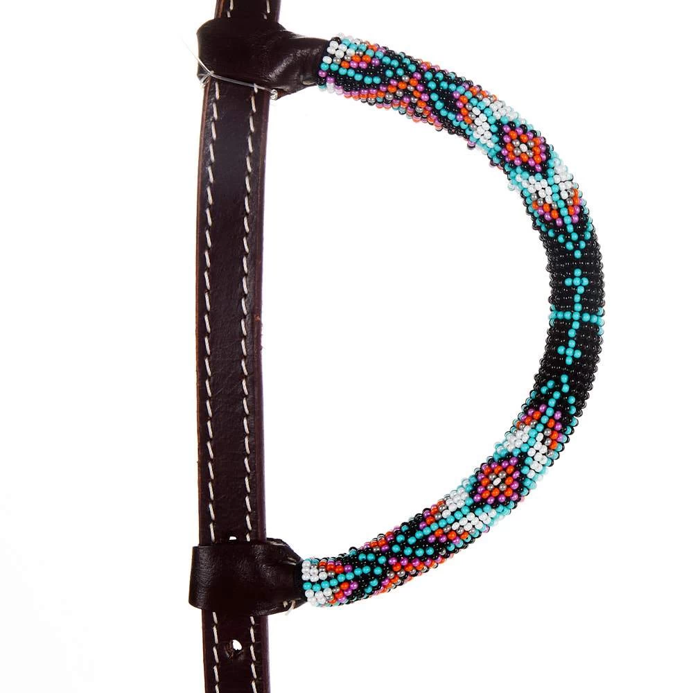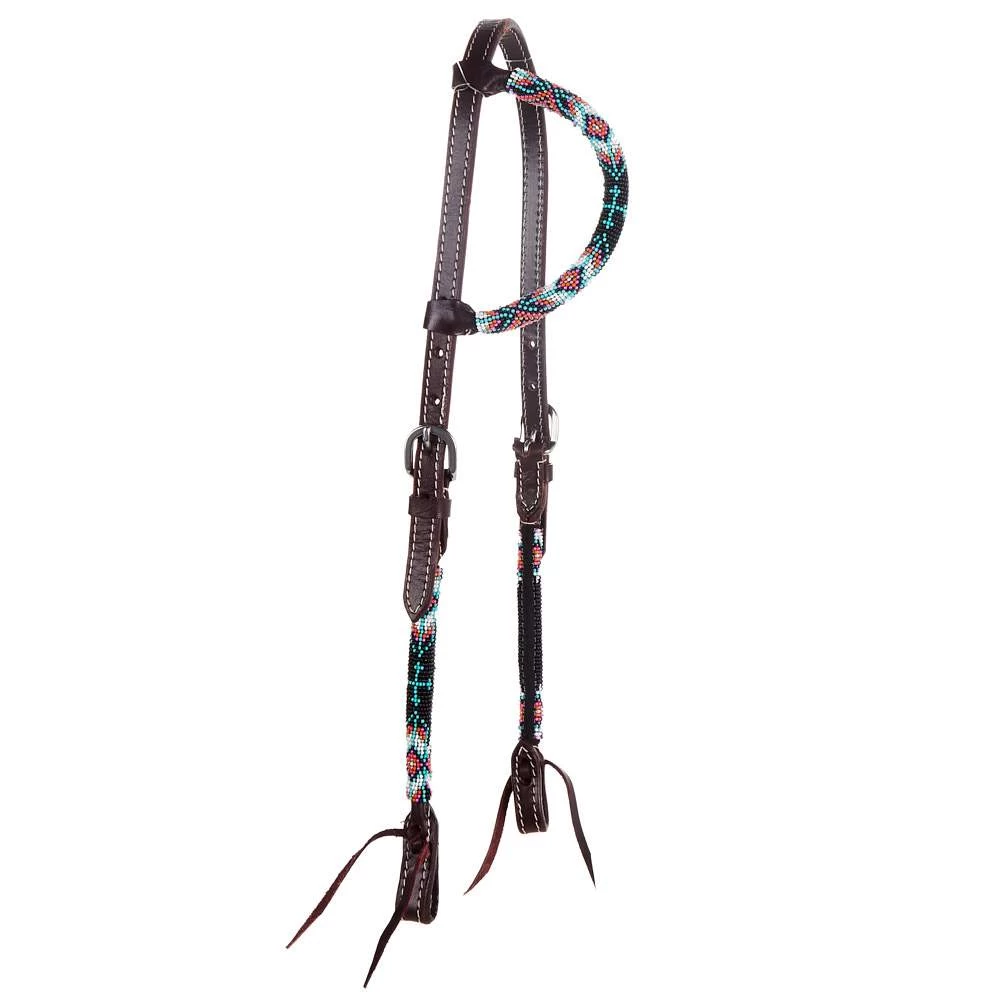 This Tough1 Beaded Single Ear Headstall is constructed of supple latigo leather and features a colorful hand-beaded wrap with a cross design on the cheek. Adjustable at cheek on both sides. Tie bit ends.